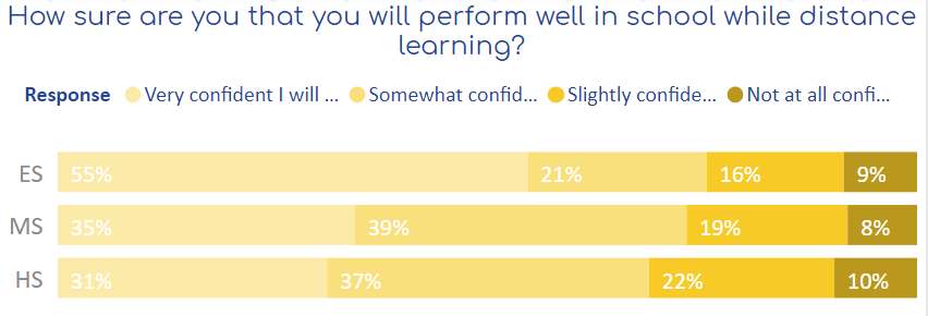 Elementary school students were more likely to report confidence in their success this year (55 percent are very confident) and appear to be less social-emotionally impacted by the pandemic.