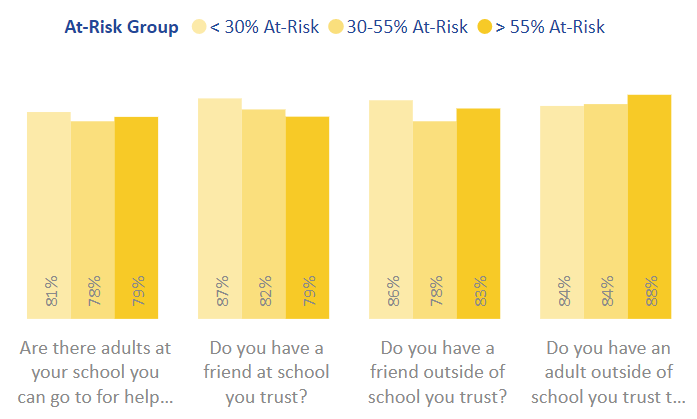 Students who attend schools that serve a majority at-risk student population were less likely to report that they have a friend at school and that they feel loved. On the positive side for schools, there were no differences across student and school demographics to the question, “Are there adults at school you can go to for help if you need it right now?” Across all schools, four-fifths of students answered that there was at least one adult at school they could go to for help right now (81 percent at low at-risk schools and 79 percent at high at-risk schools).