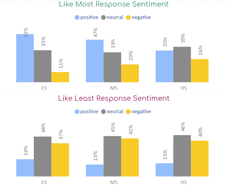 We asked students what they liked most and least about the school year so far, analyzing the data for common words and sentiment. These charts show the percent of students responding to those questions with something positive, neutral, or negative. You can see high school students were much less likely to write something positive to the question about what they like most about school.